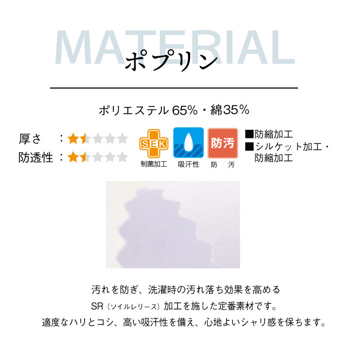 汚れを防ぎ、洗濯時の汚れ落ち効果を高めるSR(ソイルレリース)加工を施した定番素材です。