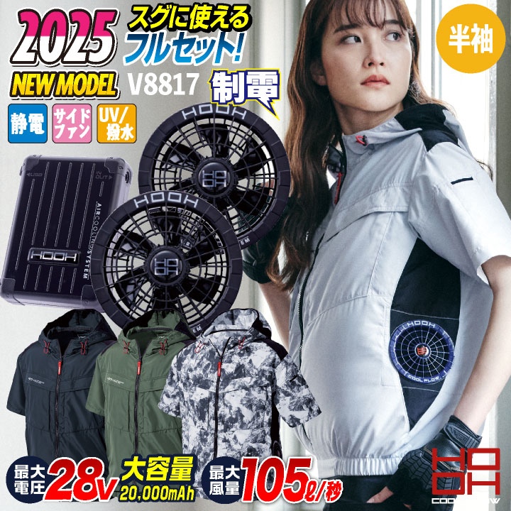 V8817 空調作業服 半袖 ファンバッテリー フルセット サイドファン仕様 半袖フードジャケット 男女兼用