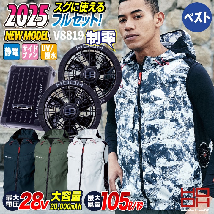 V8819 空調作業服 ベスト ファンバッテリー フルセット サイドファン仕様 フード 男女兼用