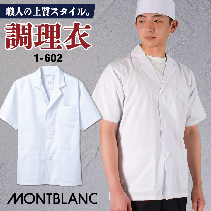 シンプルデザインの、襟付き半袖調理衣。制菌加工を施し、和食・給食で大活躍! メンズ 住商モンブラン 1-602