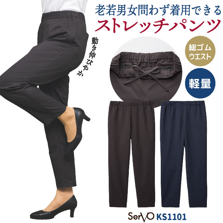 KS1101 サーヴォ 男女兼用パンツ シンプルで老若男女問わず着用できるパンツ。 飲食はもちろん幅広い業種で着用できます。 防シワ・速乾でお手入れ簡単! ・モニターにより実際の色と多少ちがって見えることがあります。人気商品のため、商品在庫が欠品することがあります。