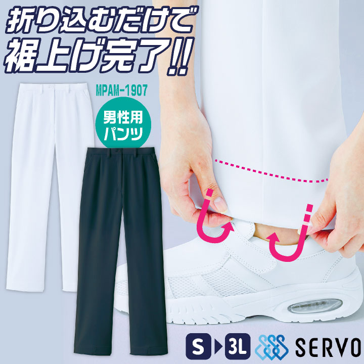 MPAM-1907 サーヴォ 男性用パンツ 織り込むだけで、裾上げ完了!! 面倒な丈つめなしでジャストな長さになるロールイン・パンツ。 制菌 制電 吸汗速乾 ストレッチ 防透 ・モニターにより実際の色と多少ちがって見えることがあります。人気商品のため、商品在庫が欠品することがあります。