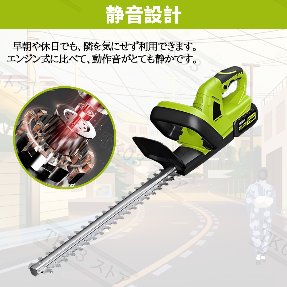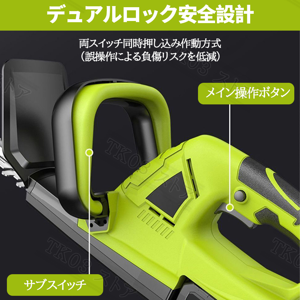 デュアルスイッチコントロールは、ヘッジトリマーを開始する前に2つの確認を行うように設計されているため、二重の保護を提供し、不正スタートの潜在的な危険を回避します。低騒音設計、回転速度は約3000回/分です、家族や隣人への騒音なし、低振動、古他のモデルよりも静か。