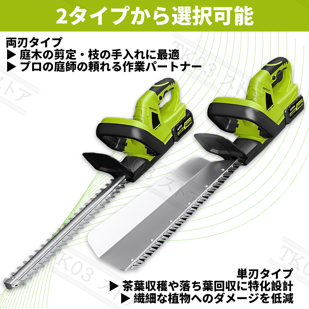 ダブル刃のヘッジトリマーに加え、単刃設計の専用落葉収集用モデルもご用意しており、茶摘みにも適用できます。