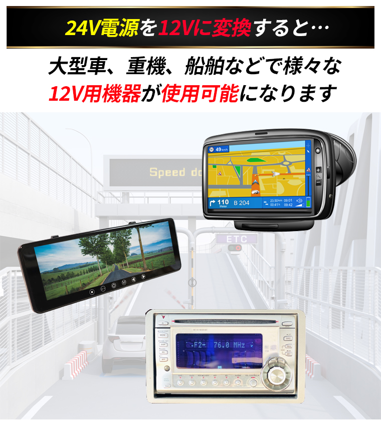 ■【汎用性】通常では電圧が違う為、使用出来ませんが、DC-DCコンバーターを使用する事で24V車でも12Vの電源を供給することが出来ます。