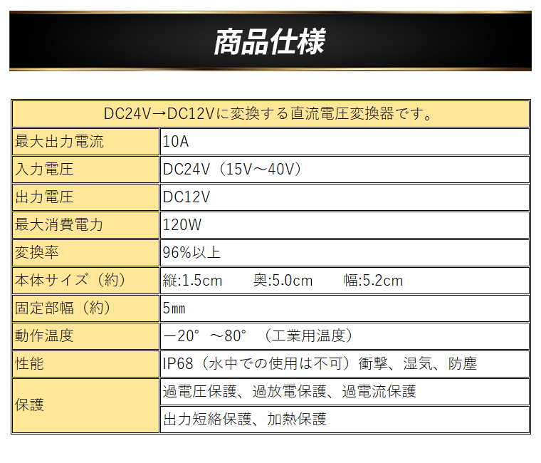 デコデコ 直流コンバータ 24V(DC15-40V)入力 DC12V 10A出力 120W 降圧 防水 電圧安定化 サージプロテクタ レギュレータ トラック/車両/ボート/ソーラー