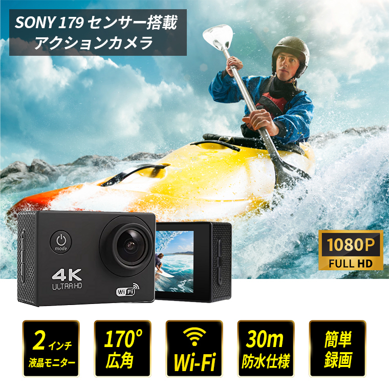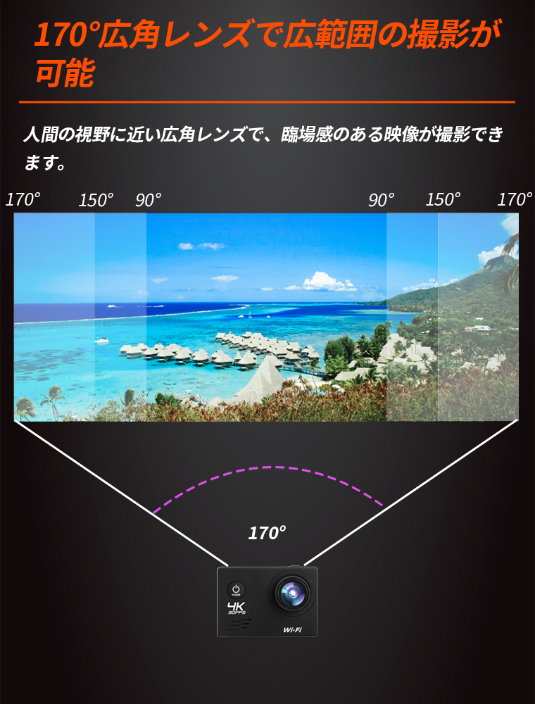 170度の広角レンズが搭載し、広い角度が撮影できます。2インチの液晶スクリーンが搭載して、1.5インチより画面確認がやすくなり、持ち運び便利なアクションカメラです。