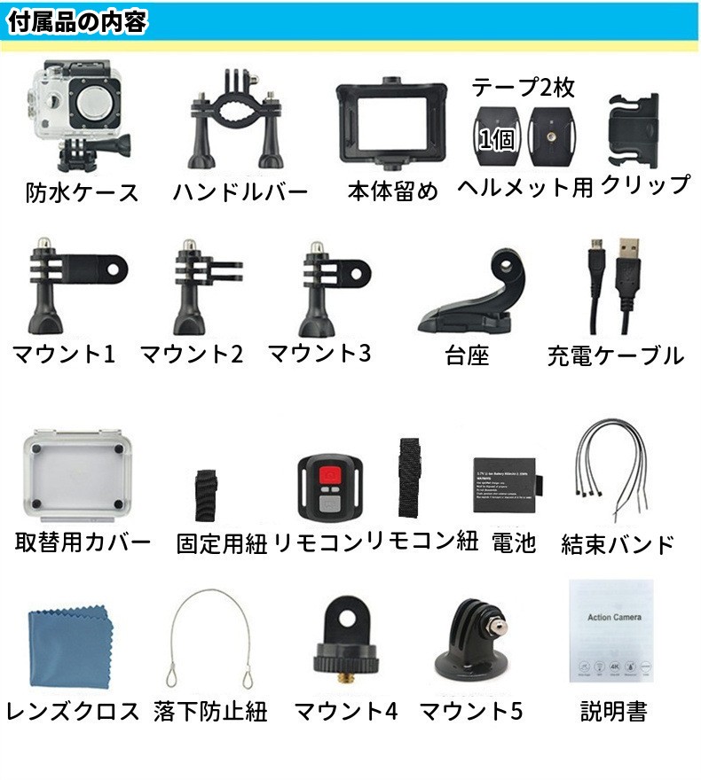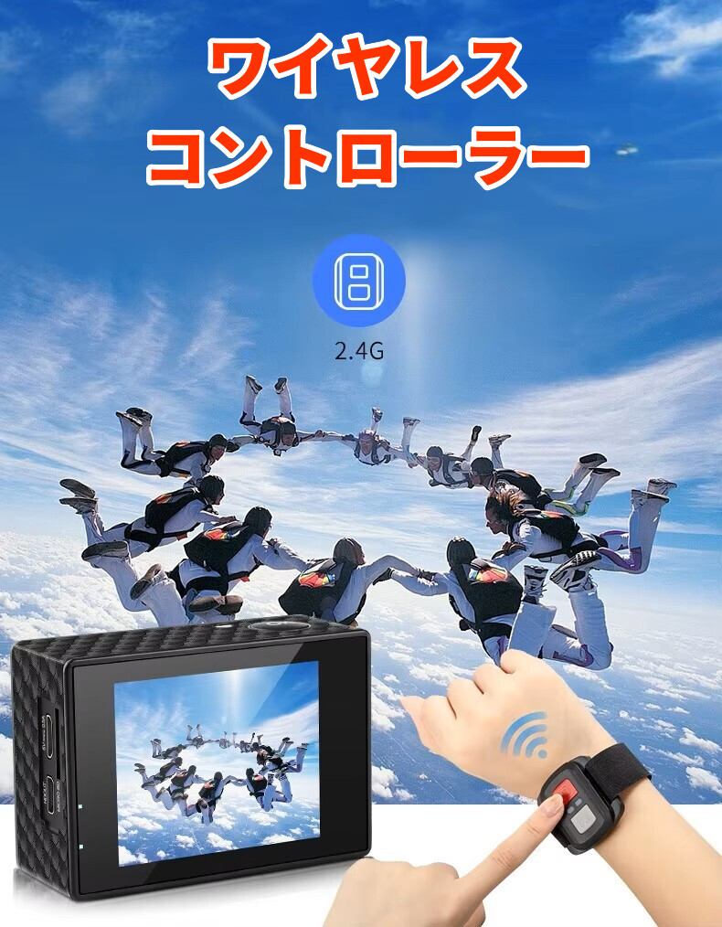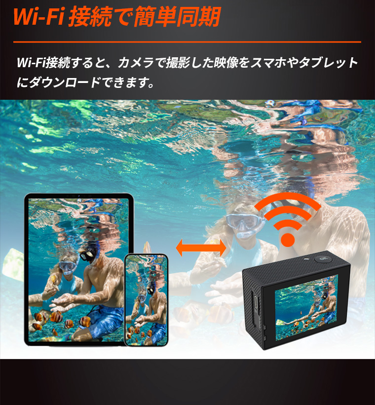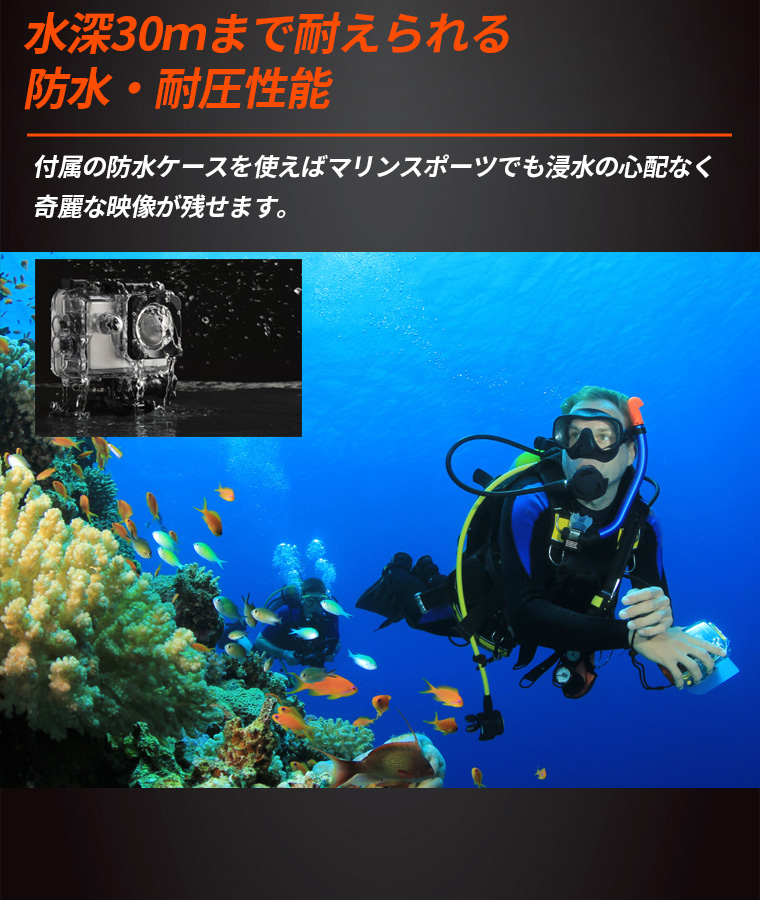 1400万画素のCOMSセンサーが搭載し、1080PフルHD超高い解像度。防水ケースがあり、30メートル防水で、水中撮影にができます。