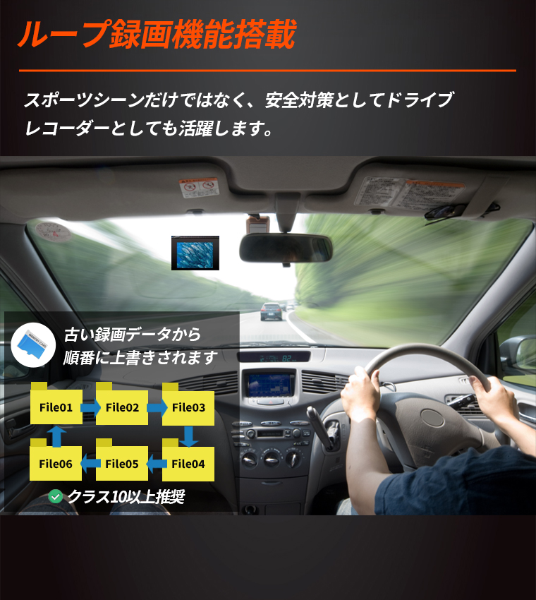 ドライブレコーダー機能も搭載で、バイクや自転車、カートや車に取り付けられます。野外活動、エクストリームスポーツ、水上運動に適します。また、ホームセキュリティ、車のDVRに活躍します。