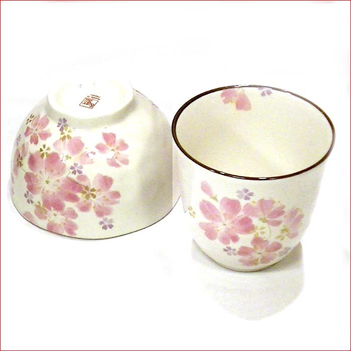 ちりめん布張りの木箱に入った、桜柄のお茶碗と湯呑みのギフトセットです。
