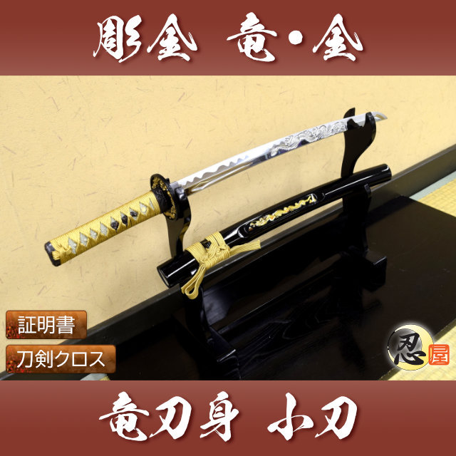模造刀 彫金 竜金 小刀 刀身竜彫 クリーニングクロス付セット 国産 コスプレ