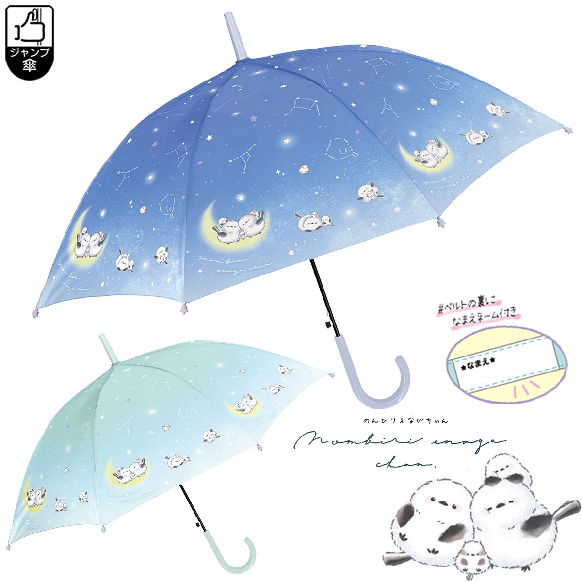 キッズ雨傘 子供長傘 のんびりえながちゃん 55cm ジャンプ傘 子供 幼稚園 小学生 女の子 女児 白い鳥 シマエナガ グラスファイバー 長傘 名前欄つき