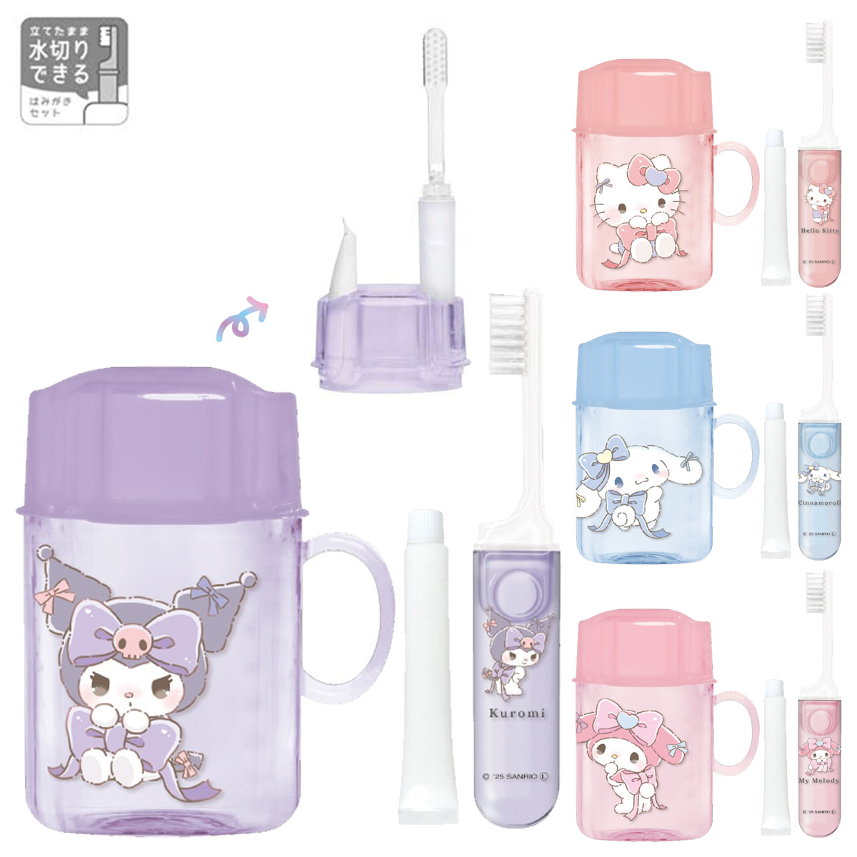 サンリオキャラクターズ 立てたまま水切りができる 歯磨きセット [ 日本製 コップ付き 持ちて付き コンパクト 携帯 歯ブラシ コップ 修学旅行 お泊り ]