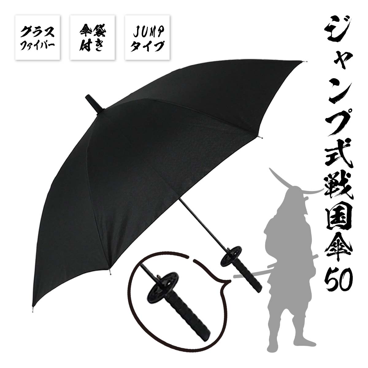ジャンプ式戦国傘50 肩にかけられる専傘袋付き 刀みたいな傘 刀剣 日本刀 ショートタイプ 小さめ 雨傘 長傘 侍ジャンプ傘 ワンタッチ式 ギフト 贈り物
