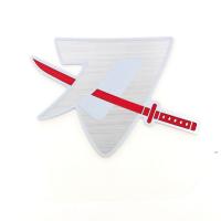 表 :平面 ヘアライン仕上げメッキベースにメタリックシルバーで縁取り 日本刀がレッド