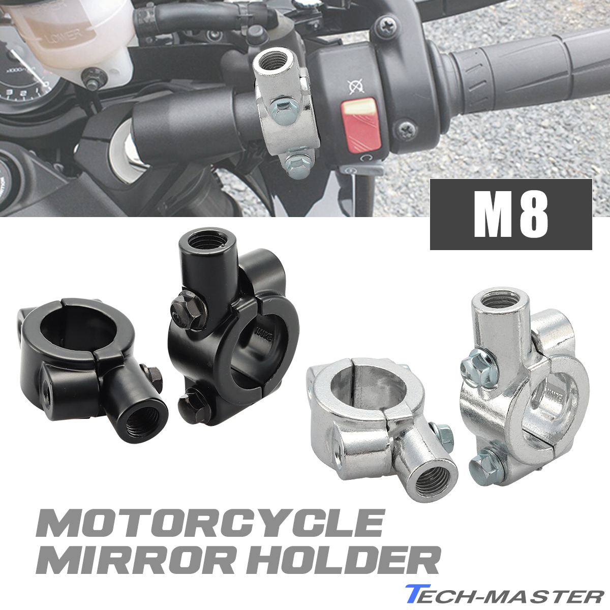 M8 正ネジ ミラー ホルダー ミリバー 22.2mm ハンドル用 クランプ式 ブラケット 2個セット