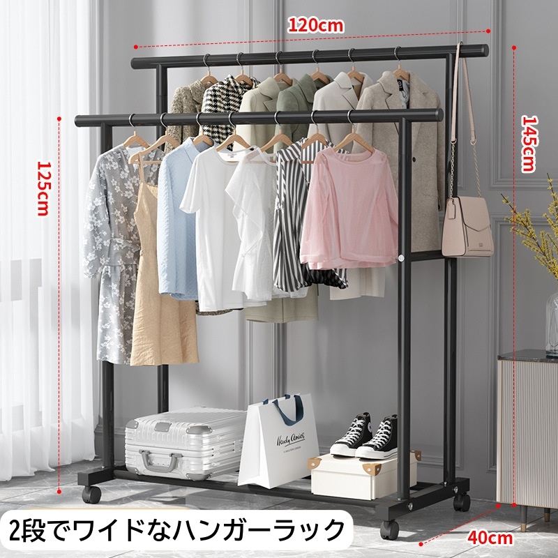 ハンガーラック 2段 頑丈 キャスター付き パイプハンガー 大容量 衣類収納 洋服掛けラック 子供服 洋服収納 室内干し 洗濯物落ち防止対策 クローゼット