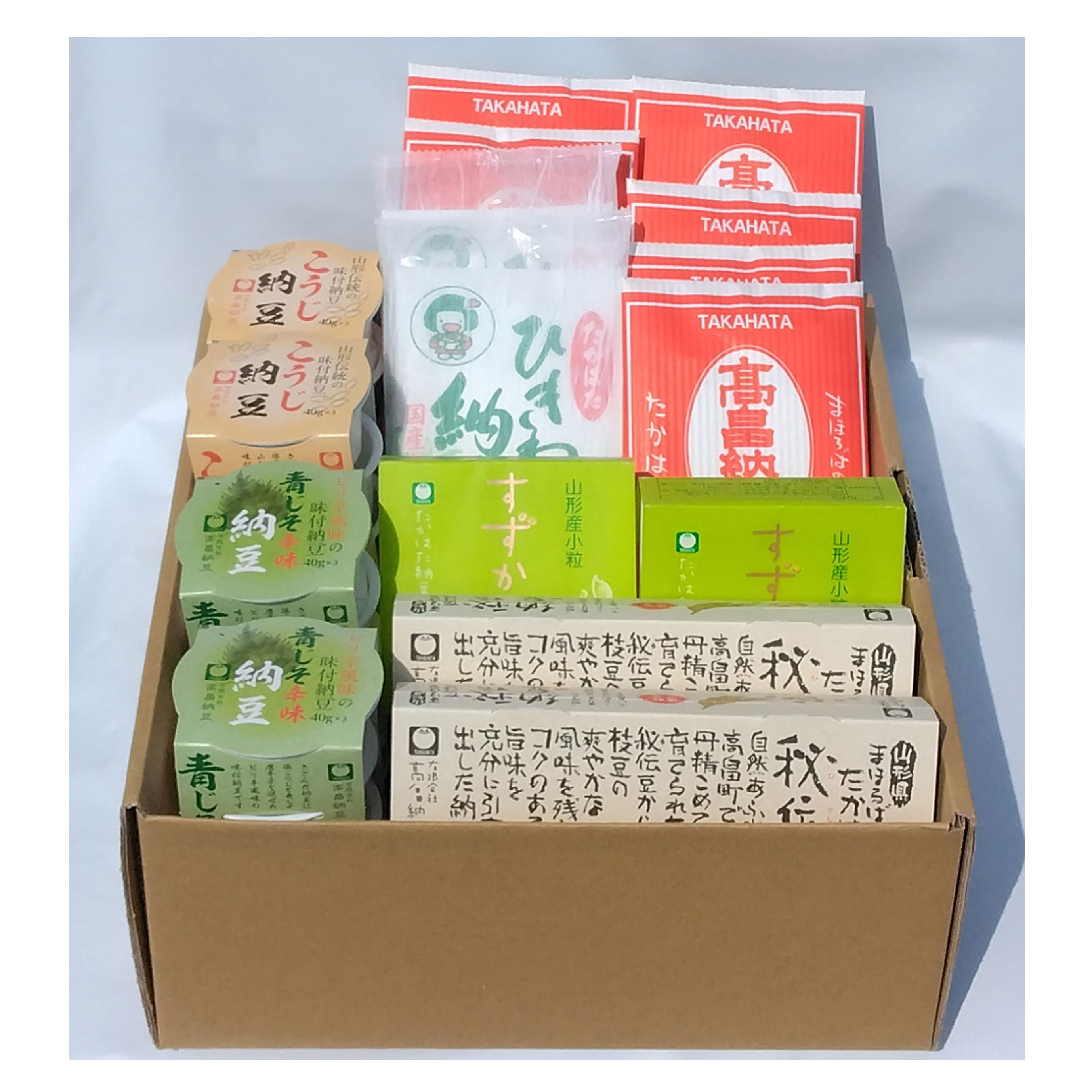 中粒大豆、小粒大豆、ひきわり大豆に秘伝豆、さらには味付き納豆のこうじ納豆、青じそ辛味納豆と、高畠納豆ならではの味が一つに詰まった詰め合わせ商品です。