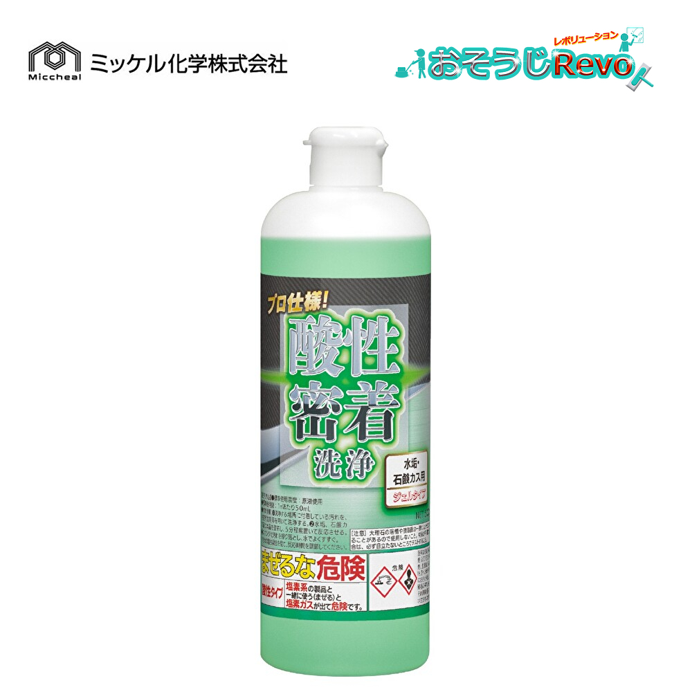 ■JAN:4986167001004■商品コード:151400■メーカー:ミッケル化学株式会社■商品名:プロ仕様 酸性密着洗浄 水垢・石鹸カス用 ジェルタイプ■容量:500g■成分:界面活性剤、ポリオキシエチレンアルキルエーテル、スルファミン酸、グリコール酸(ヒドロキシ酢酸)、溶剤、増粘剤、色素、水■Ph:1未満(原液、25℃)、2-3(1%、25℃)■標準希釈倍率:原液