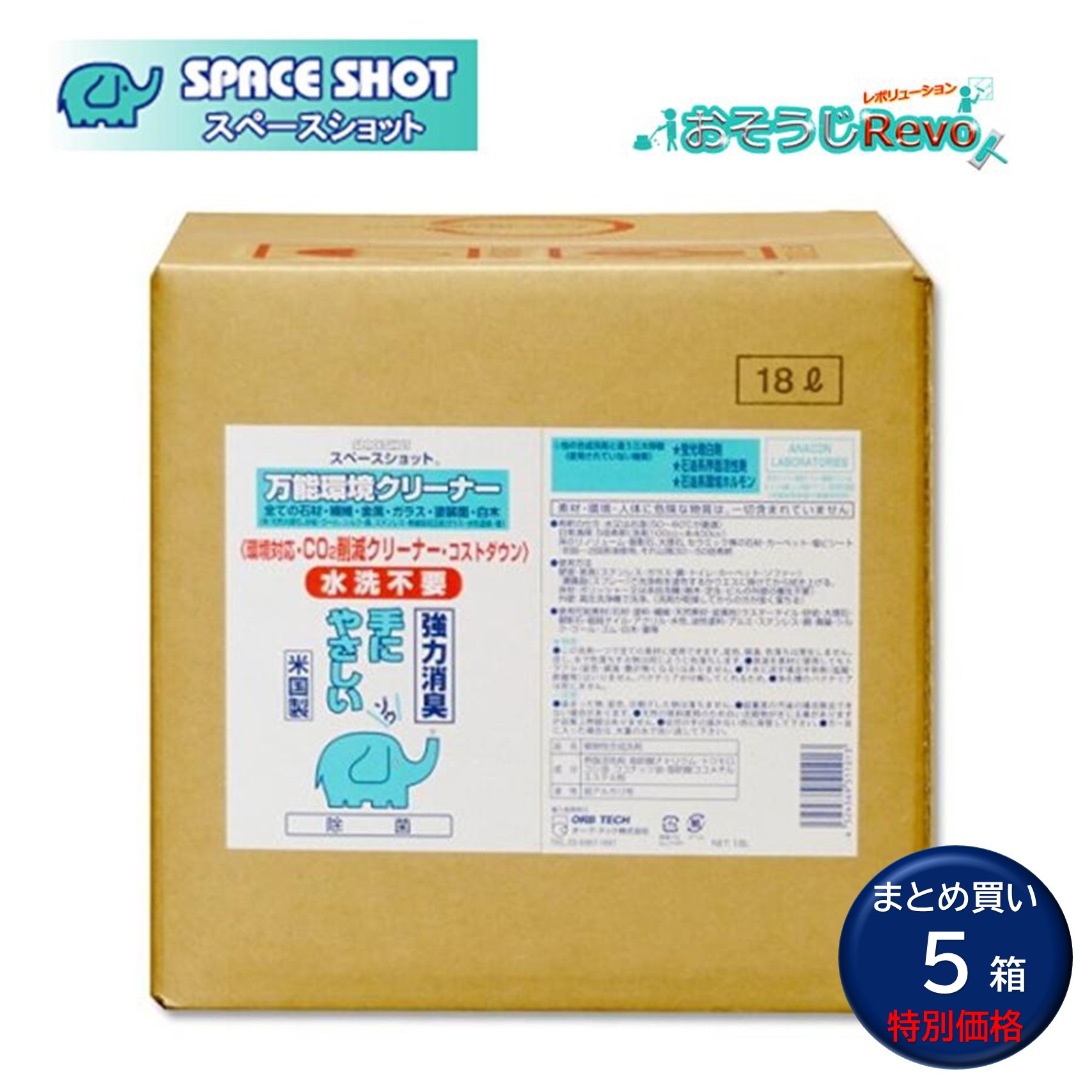 ■JANコード:4524569511013■メーカー:オーブテック■商品名:スペースショット万能環境クリーナー■容量:18L■入数:5箱セット■成分:界面活性剤、石けん成分=脂肪酸ナトリウム、トウモロコシ油、ココナッツ油、脂肪酸ココメチルエステル他■Ph: 10.7(弱アルカリ性)■標準希釈倍率:原液-50倍希釈
