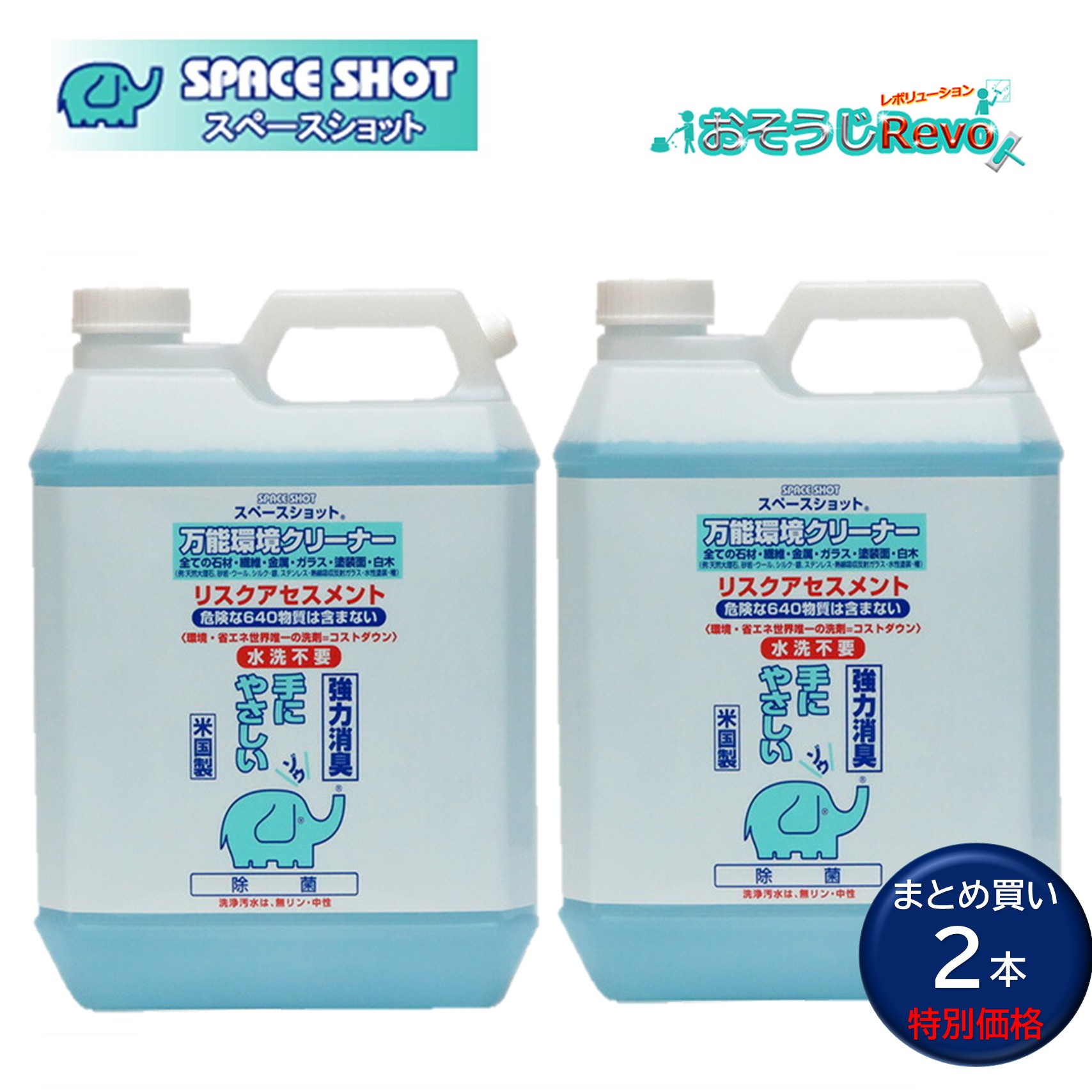 ■JANコード:4524569505012■メーカー:オーブテック■商品名:スペースショット万能環境クリーナー■容量:4L■入数:2本セット■成分:界面活性剤、石けん成分=脂肪酸ナトリウム、トウモロコシ油、ココナッツ油、脂肪酸ココメチルエステル他■Ph: 10.7(弱アルカリ性)■標準希釈倍率:原液-50倍希釈