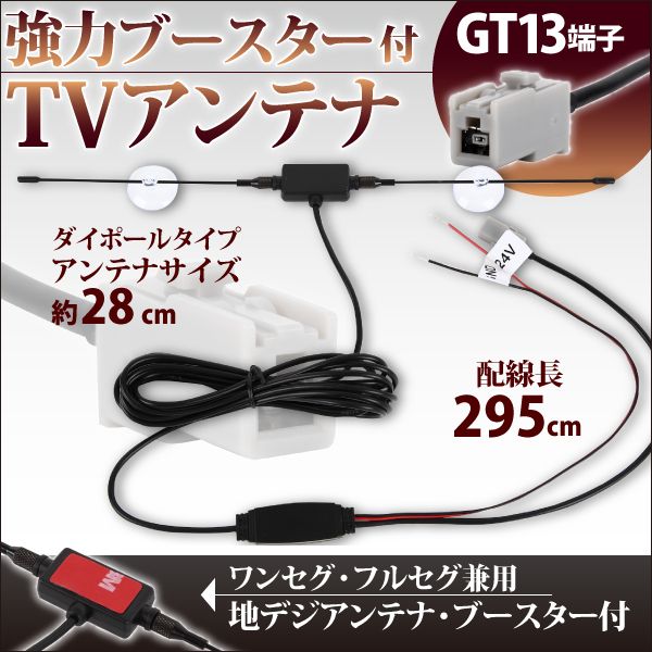 〜メール便発送可!吸盤付強力ブースター内蔵型アンテナ GT13端子〜 特注仕様のダイポールアンテナになります。 12V車〜24V対応 強力20dBブースター内蔵 ワンセグ・フルセグ両対応 フィルムアンテナは貼り付けすると移動できませんが、このアンテナは吸盤式なので、何度でもお好きな位置に取り付けできます。 よろしければこちらもご利用ください。 フィルムアンテナ GPSプレート 両面テープ GPSフィルムアンテナ ◆◆注意事項◆◆ ご自身のアンテナ、コネクタご確認いただき、画像や寸法を確認の上御購入いただきますようお願い致します。 天候・場所等により受信感度が悪くなる場合がありますが異常ではありません。 アンテナブースターは現在受信している電波を電源により安定させる役割をもつ機能であり、微弱な電波を強くして映りを良くするものではありません。 車種ごとの取付説明書はございませんのでご了承ください。 電波の受信感度の向上を保証するものではありません。 ワンセグの機種をフルセグにすることは出来ません。 メール便発送の場合、万が一エレメントが折れたり曲がったりしていましても保証がありませんことをご了承の上ご購入願います。 新品未使用品ですが外観の汚れ保管の際の傷等がある場合がございます。 メール便での発送は厚み制限の関係上製品をそのまま封入する場合があります。御了承ください。 外観の傷、商品の若干の傷等は使用上問題ありませんので、ご容赦ください 完璧を求める方、極端に神経質な方の購入はご遠慮ください 写真はイメージです 写真と実際の商品の外観が予告なく変わる場合がありますが、使用には問題ありませんのでご理解ください ブラウザの関係で実際の色とは異なる場合がございます 本商品は到着後7日間の初期不良対応が適用されます 加工および一度使用した商品、両面テープを剥がした商品の返品及び交換には対応できません (到着後すぐに目視にて商品をご確認ください) 吸盤が弱いという不良は保証範囲外とさせていただきます。(施工状態により大きく左右されるため) ノーサポート商品です。 ご自身で取り付けできない場合は専門の知識を持った専門店で取付けを行うことをお勧めいたします ◆◆免責事項◆◆ 法律上の請求原因の種類を問わずいかなる場合においても、 購入した製品自体、または製品の使用から生じた直接的、間接的な損害に関して、 弊社はその一切の責任を負わないものとします | ||||||||