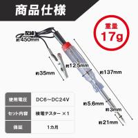〜フィルムアンテナと両面テープと脱脂クリーナーのセット〜 弊社提携工場での直接大量製造のため、品質を落とさず、価格を極限まで落とすことに成功しました。 純正品ではありませんが、専門家監修により作成された製品ですので、御安心ください。 DC6V〜DC24Vまで検電可能な検電テスターです。 重量はわずか17gと軽量になっております。 全長137mmなのでポケットに入れて持ち運ぶことも可能です。 また、通電を確認するとライトが点灯する為、一目で確認可能です。 【使用方法】 1.クリップを金属の未塗装部分等に取り付け、アースを取ります。 2.先端を配線に刺します。 3.ライト点灯→通電あり ライト無点灯→通電なし ◆商品仕様 セット内容:検電テスター×1 使用電圧:DC6V〜DC24V 全長:137mm 重量:17g 保証:1カ月(初期不良の場合は商品到着後、7日間以内にご連絡ください。) 大量購入をご希望の方は質問よりお問い合わせください。 | ||