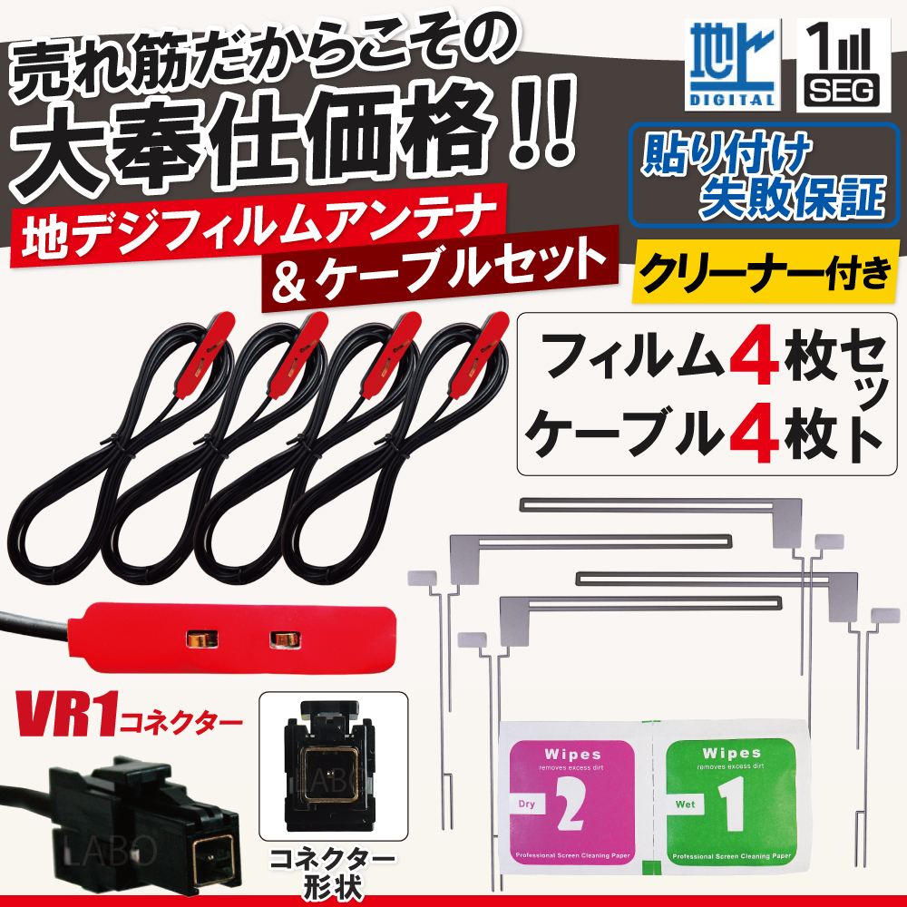 〜メール便発送可能!L字型フィルムアンテナ&ケーブルセット〜 商品名:アルパイン/イクリプス/トヨタ/パナソニック製ナビ L字型フィルムアンテナ右2枚左2枚&ケーブル4本&クリーナー1枚セット 最適な電波状態を保つため、ナビ型式別に電気的な調整を施しています。 適合コネクター:VR1 弊社提携工場での製造のため、品質を落とさず、価格を極限まで落とすことに成功しました。 純正品ではありませんが、専門家監修により作成された製品ですので、御安心ください。 ブースター内蔵型で独自に最適なアンテナゲインを調整しています。 フィルムアンテナはエレメント部分だけ残るタイプを採用。 商品を厚紙に挟み、曲がらないように発送します。 ワンセグからフルセグまで、地デジに対応した機器の外部アンテナとしてご使用いただけます。 取付形状をよくご確認の上、お買い求めください。 ブースター内蔵型ケーブルの長さは約5mです。 よろしければこちらもご利用ください。 フィルムアンテナ GPSプレート 両面テープ GPSフィルムアンテナ | ||