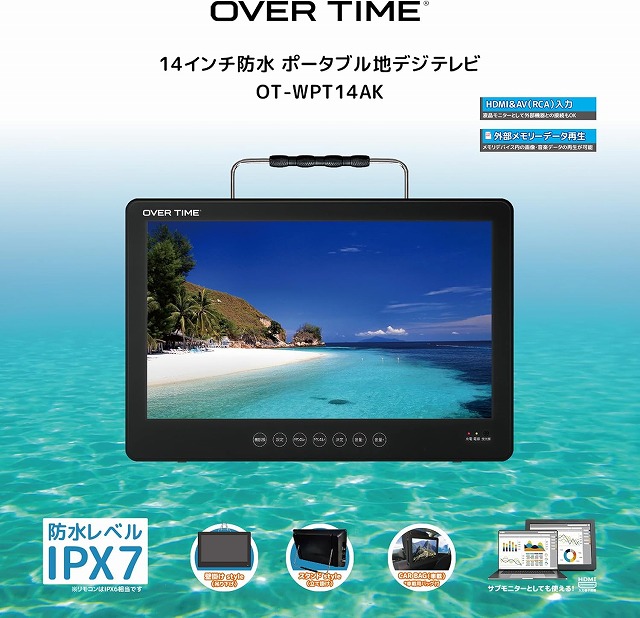 14インチ 録画機能搭載 防水ポータブルテレビ 車載対応 OT-WPT14AK OVERTIME