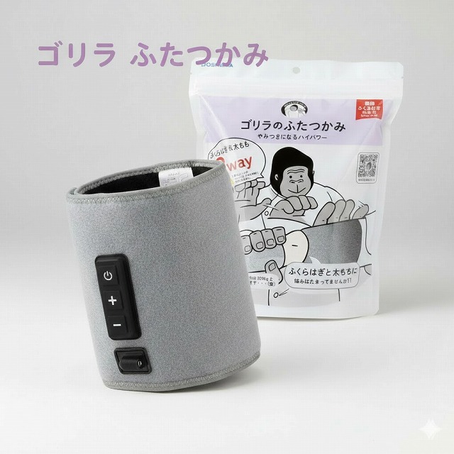 ●太もも&ふくらはぎの2WAYケア『ぽこぽこパーツ』はまるでゴリラにツボを押されているかのよう!強力ポンプでエアバッグにグングン空気を送り込むエア式。「痛気持ちいい」ハイパワーを再現し、このサイズでも本格フットケアが楽しめます。●楽々!面ファスナー装着面ファスナーだから脚にベルト感覚で巻くだけの簡単装着。男性・女性問わずどなたでも心地よくお使いいただけます。軽量コンパクトなので旅行先などへの持ち運びにも最適!●直感的に使えるボタン操作電源ボタンを押してスタートするだけ!ボタン一つで強弱調節もできて、だれでも簡単に使えます。●安心の10分タイマーやりすぎと切り忘れを防ぐ自動電源オフ機能付き!対応サイズ(約):ふくらはぎ周囲 37〜60cm、太もも周囲 41〜60cm材質:本体:表生地・裏生地 ポリエステル100%質量(約):430 g(ACアダプター含む)