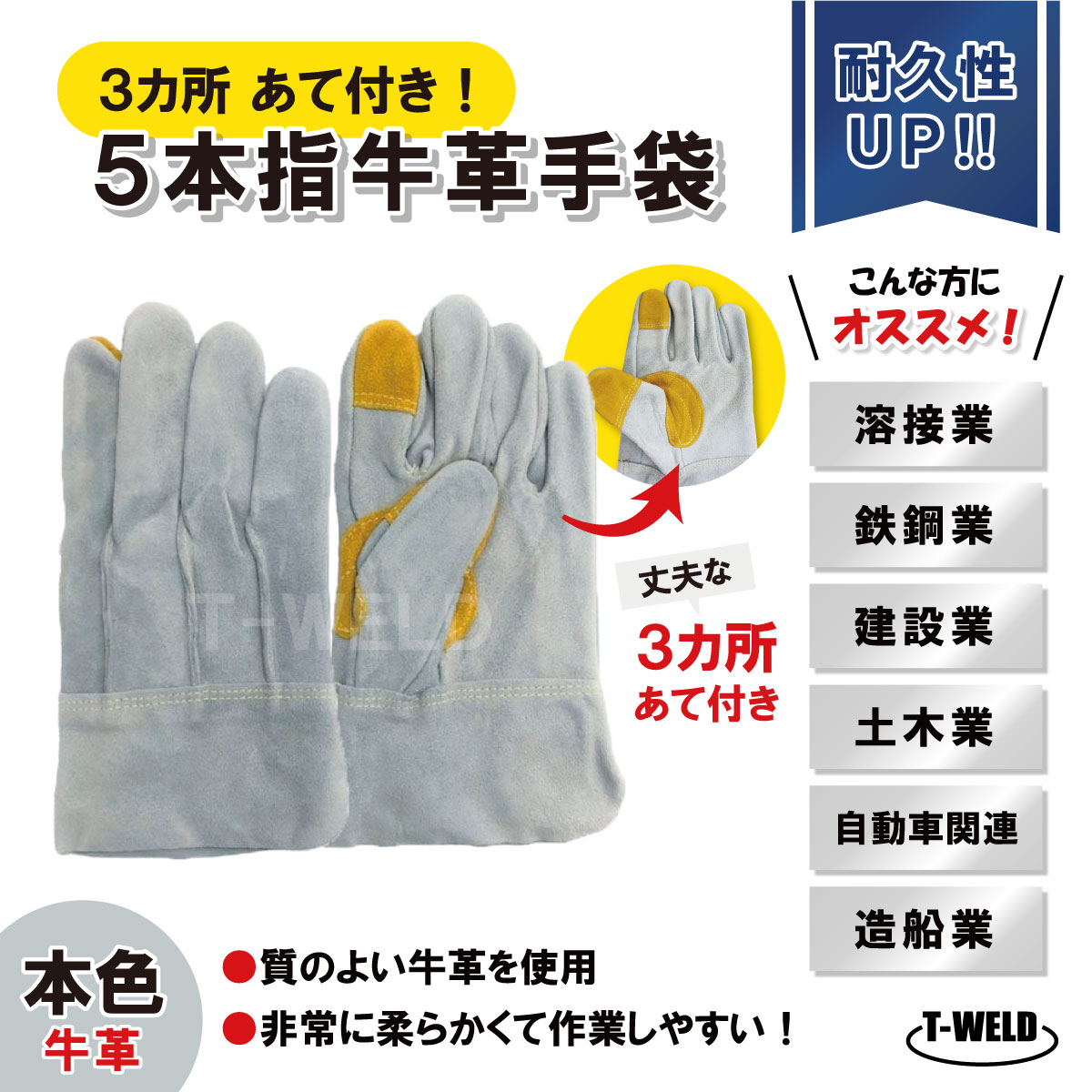 溶接 鉄鋼 建設 作業用 革手 5本指 牛革手袋 本色 長さL:25cm 3カ所あて付き 1双単価