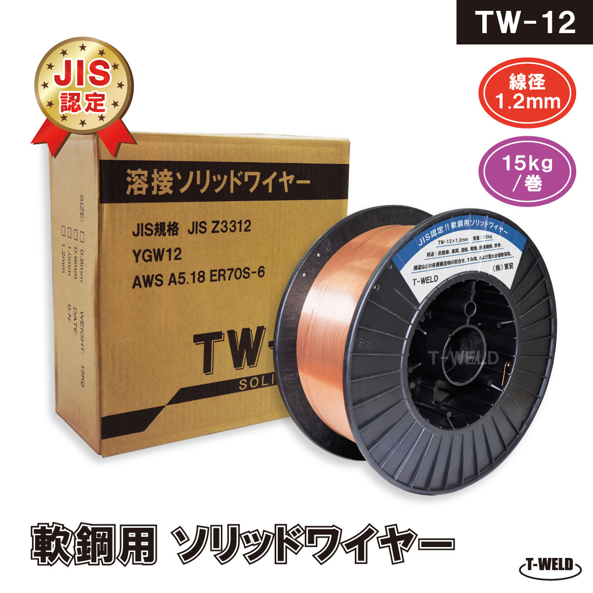 JIS認定 溶接ソリッドワイヤ TW-12 1.2mm ×15kg/巻 YM-28 MG-50T YM-50T SM-70 KC-28 等適合 1巻