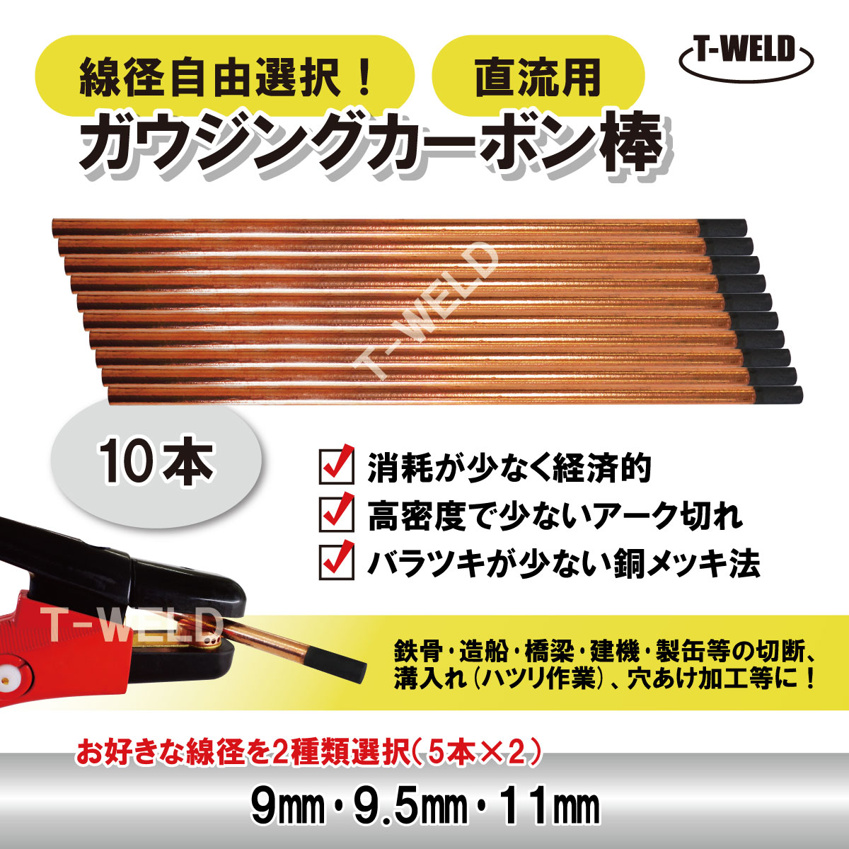 線径自由選択 直流用 ガウジングカーボン棒 10本 (線径 9mm 9.5mm 11mm )