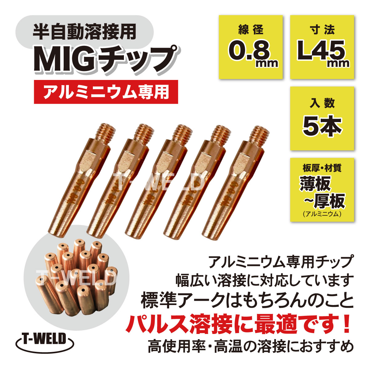 半自動 溶接 MIG チップ アルミニウム専用 AL 0.8mm×45mm アルミ 5本セット