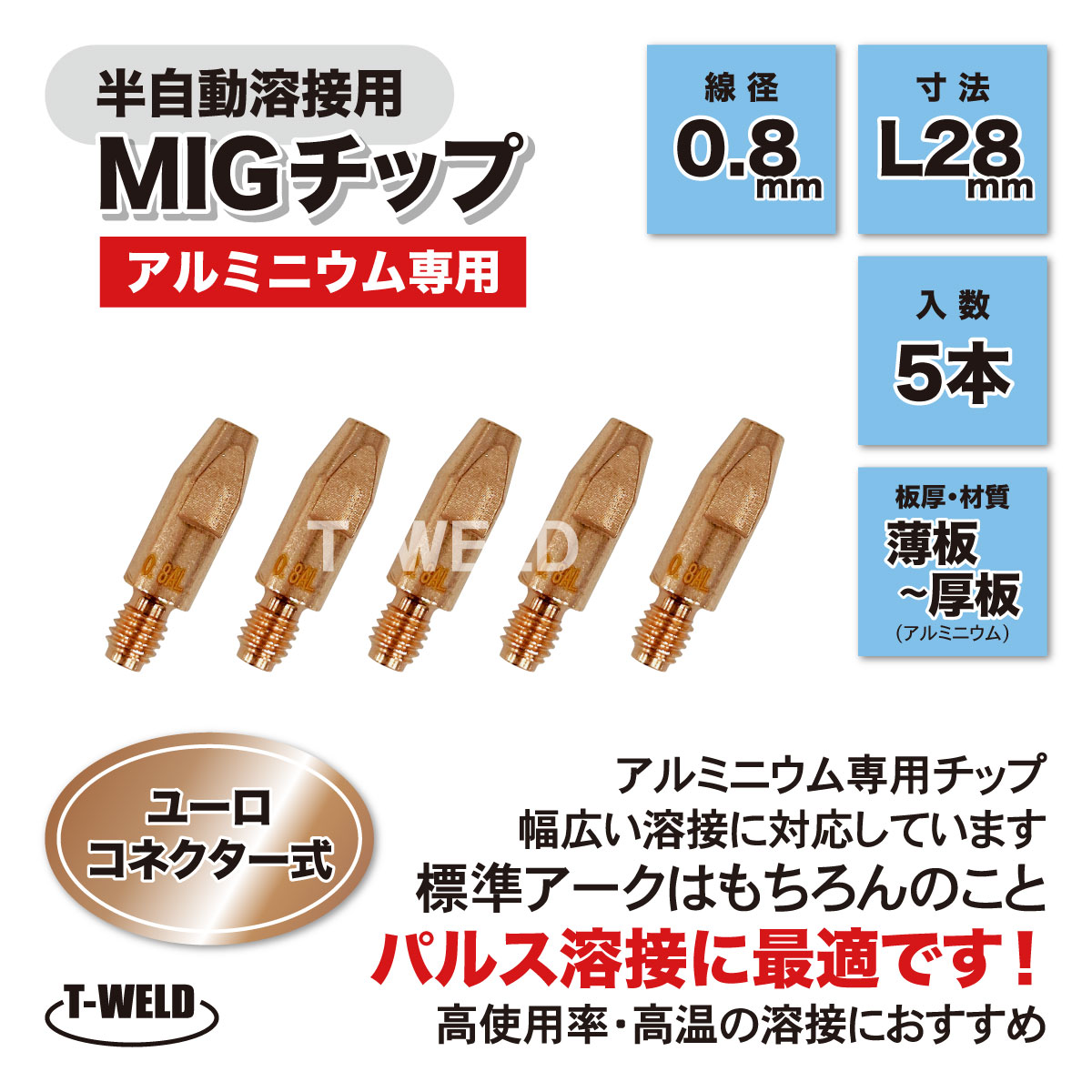 半自動 溶接 MIG チップ ユーロコネクター式 アルミニウム専用 AL M6×28 0.8mm アルミ 5本セット