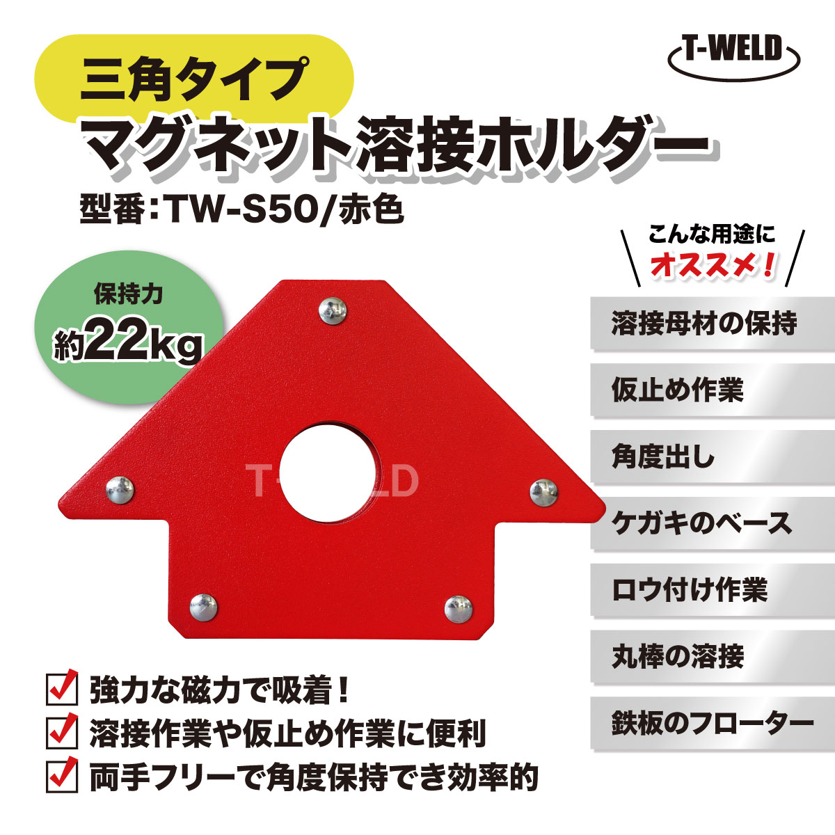 溶接 工具 三角タイプ マグネット ホルダー TW-S50 赤色 保持力 22kg 1本