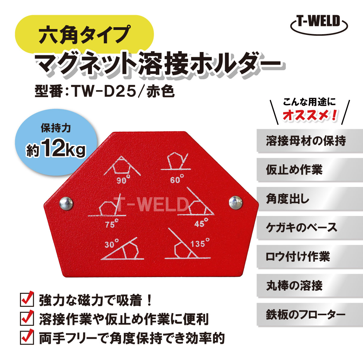 溶接 工具 六角 タイプ マグネット ホルダー TW-D25 赤色 保持力 12kg 1本
