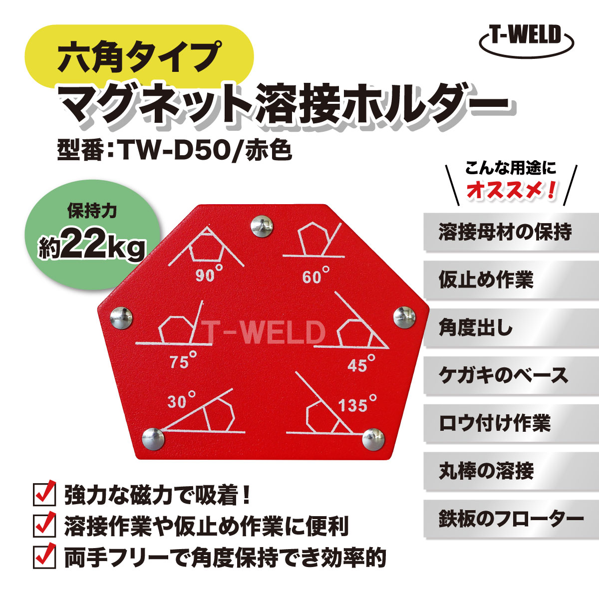 溶接 工具 六角タイプ マグネット ホルダー TW-D50 赤色 保持力 22kg 1本