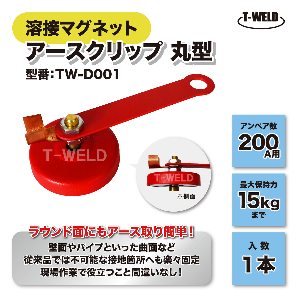 溶接 マグネット 工具 丸型 200A アースクリップ アースホルダー 赤色 TW-D001 保持力 15kg 1本