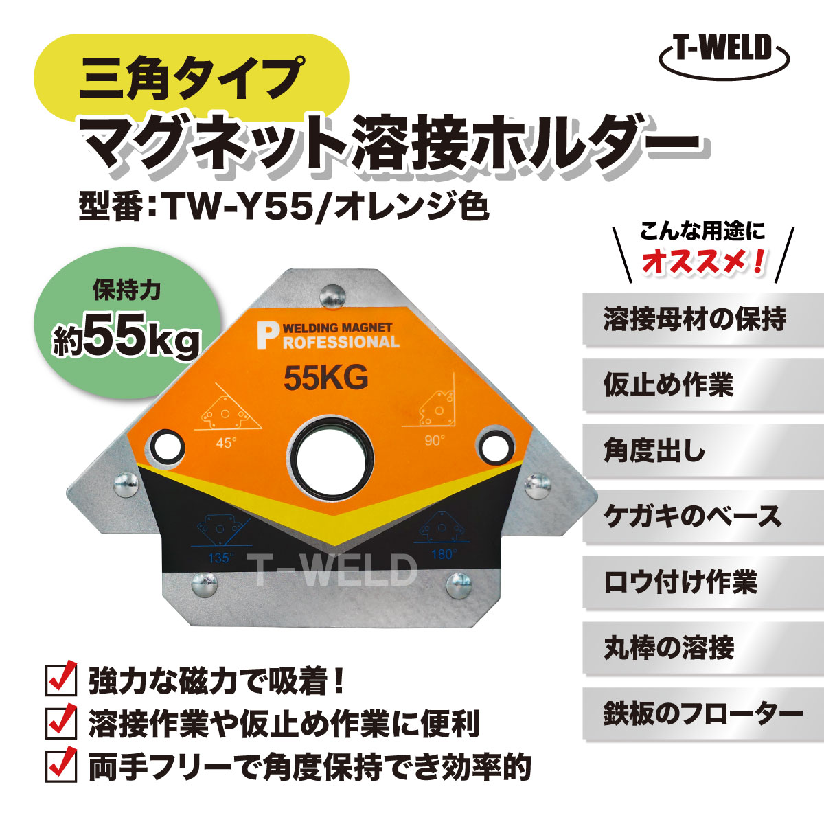 溶接 工具 三角タイプ マグネット ホルダー TW-Y55 オレンジ色 保持力 55kg 1本