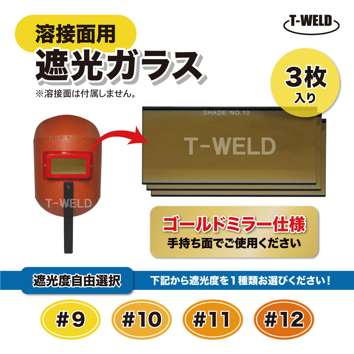 溶接面用 遮光ガラス 色ガラス ( ゴールド ) ミラー仕様 3枚セット ( 遮光度選択:#9 #10 #11 #12 ) 寸法:105×50×3mm ガラス4辺研磨済み