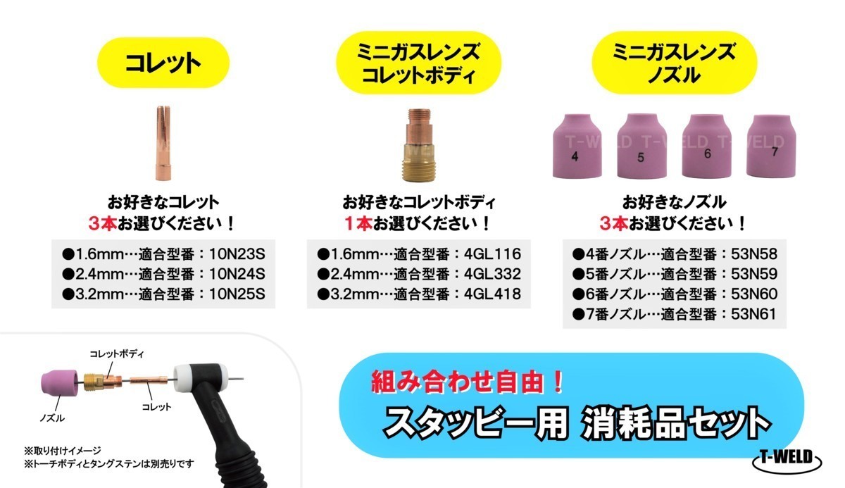 組み合わせ自由 TIG スタッビー ミニガスレンズ 用 消耗品セット ( コレット ×3本 コレットボディ ×1本 ノズル ×3本 )