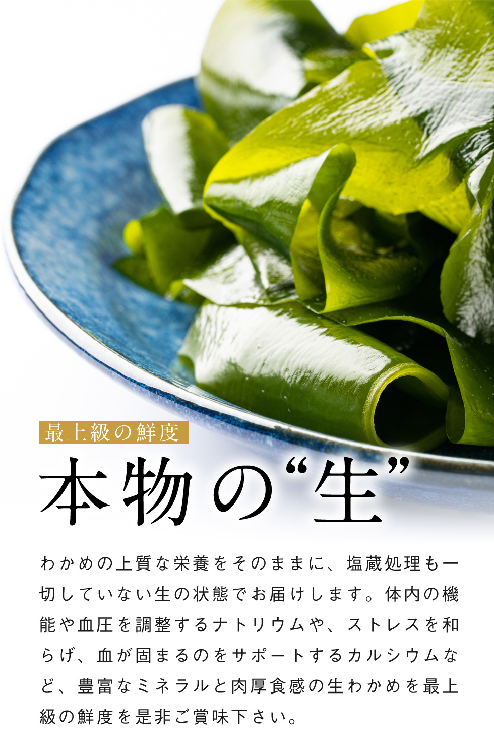 わかめの上質な栄養をそのままに、塩蔵処理も一切していない生の状態でお届けします。体内の機能や血圧を調整するナトリウムや、ストレスを和らげ、血が固まるのをサポートするカルシウムなど、豊富なミネラルと肉厚食感の生わかめを最上級の鮮度を是非ご賞味下さい。