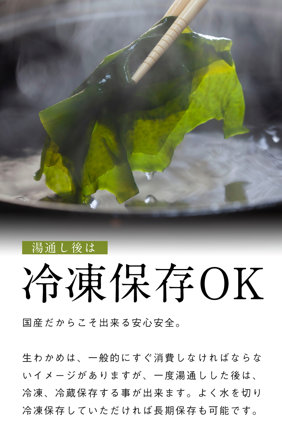 生わかめは、一般的にすぐ消費しなければならないイメージがありますが、一度湯通しした後は、冷凍、冷蔵保存する事が出来ます。