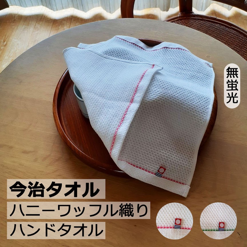 | ハニーワッフル織り。通常のパイル織りのタオルに比べて、毛羽が出にくい。 吸収性、速乾性に優れている。 蛍光剤不使用 |