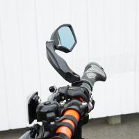 ・新型アルミエンドクランプは直径21〜26mmまで対応可能。少々の衝撃では動きません。ミラーは広域を確認出来るラウンドタイプとなっています。