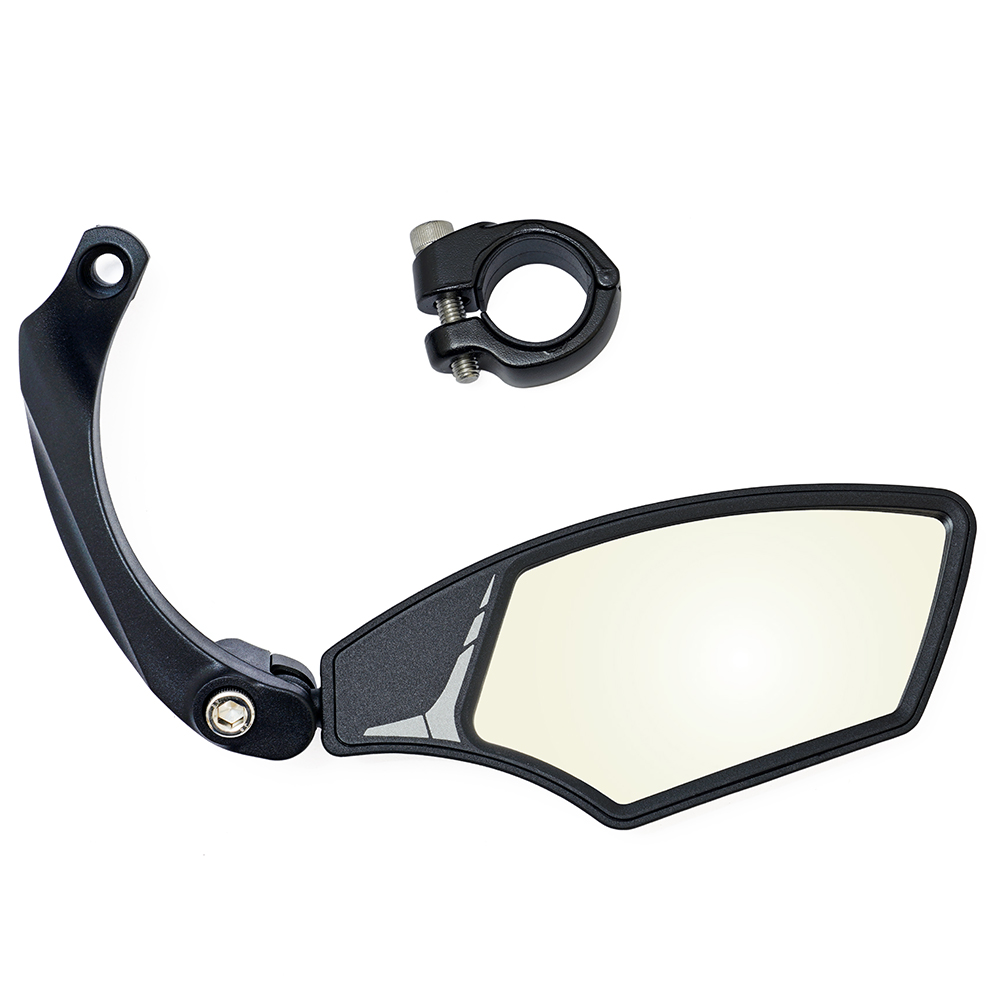 ・新型アルミエンドクランプは直径21〜26mmまで対応可能。少々の衝撃では動きません。ミラーは広域を確認出来るラウンドタイプとなっています。