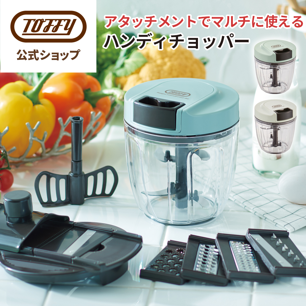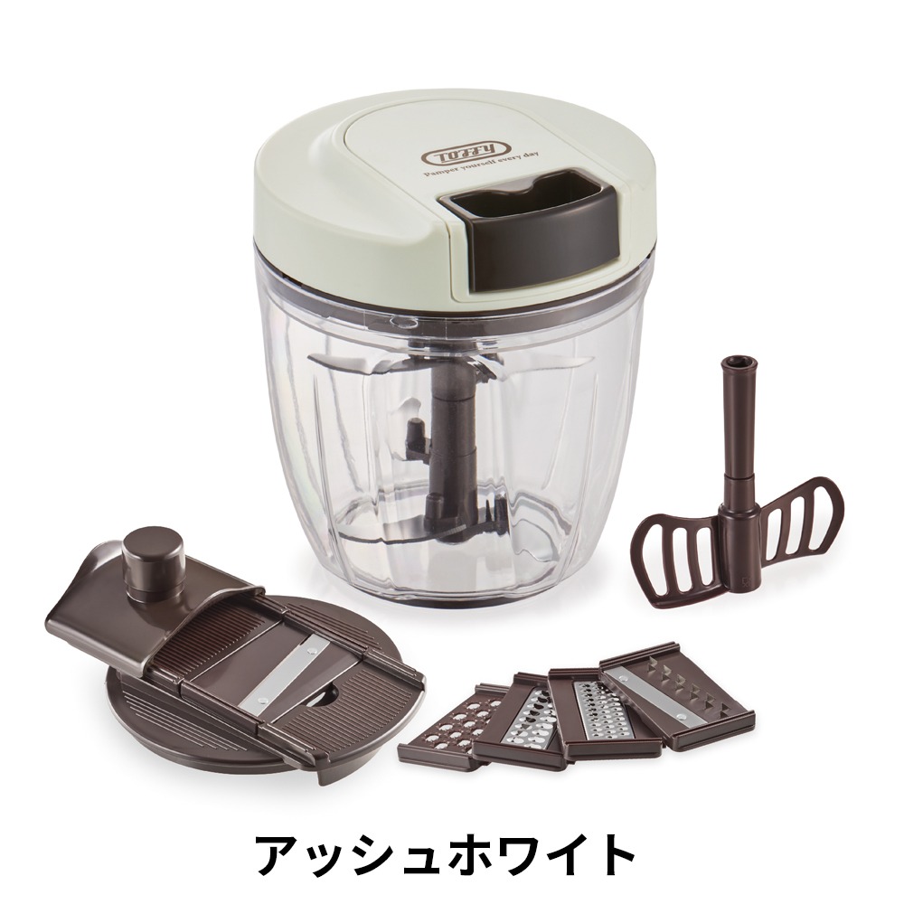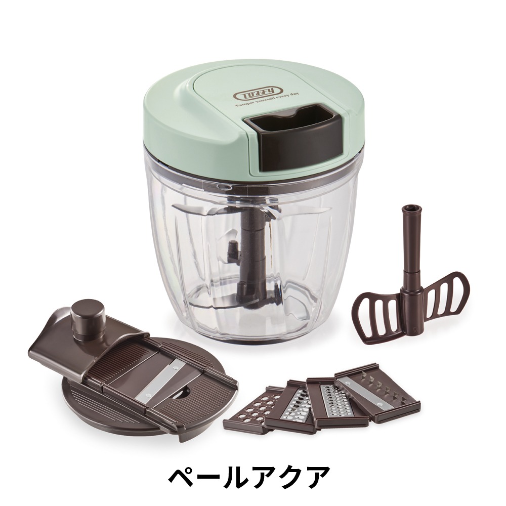 ハンディチョッパーの機能はそのままに5つのカッターパーツもついた便利な7wayのチョッパー!食材を入れて、ふたを閉めたらハンドルを引っ張るだけの手軽に使えるチョッパーです。電源不要で場所を選ばず、一人暮らしのキッチンやちょっとした調理の時間短縮にとっても便利!用途に応じて2つのアタッチメントを使い分けれらます。● 5枚カッター・・・食材をお好みの粗さに刻むことができます● ブレンダー・・・泡立てや混ぜ合わせることができますマルチハンディーチョッパーには5つのカッターパーツが付属!「薄切り」「千切り」「薄千切り」「つま切り」「おろし」の多彩なカットが可能になり今まで以上にお料理の幅を広げることが出来ます。また、内蓋付きなので液漏れしにくく、蓋の裏側が汚れにくいので簡単にお片付けが可能!調理したまま保存できる便利な保存蓋付きなのもうれしいポイントです♪