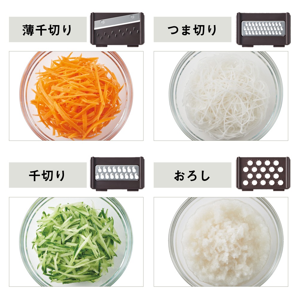 サイズ:約φ125×H145mm(5枚カッター使用時)付属品:5枚カッター、ブレンダー、内蓋、保存蓋 カッターパーツ(5種)、カッタープレート、安全ホルダー、ユーザーズガイド素材:ポリプロピレン、ポリスチレン、ABS樹脂、スチール