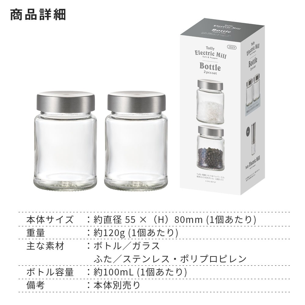 本体サイズ:約直径 55 ×(H)80mm (1個あたり)重量 :約120g (1個あたり)主な材質 :ボトル/ガラス ふた/ステンレス・ポリプロピレンボトル容量:約100mL (1個あたり)備考 :本体別売り